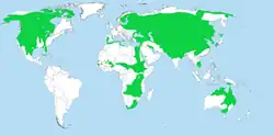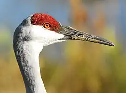 Many species of cranes are dependent on wetlands and grasslands, and most species nest in shallow wetlands. Some species nest in wetlands, but move their chicks up onto grasslands or uplands to feed (while returning to wetlands at night), whereas others remain in wetlands for the entirety of the breeding season. Even the demoiselle crane and blue crane, which may nest and feed in grasslands (or even arid grasslands or deserts), require wetlands for roosting at night. The Sarus Crane in south Asia is unique in having a significant breeding population using agricultural fields to breed in areas alongside very high density of humans and intensive farming, largely due to the positive attitudes of farmers towards the cranes.[2] In Australia, the Brolga occurs in the breeding areas of Sarus Cranes in Queensland state, and they achieve sympatry by using different habitats. Sarus Cranes in Queensland largely live in Eucalyptus-dominated riverine, while most Brolgas use non-wooded regional ecosystems that include vast grassland habitats.[14] The only two species that do not always roost in wetlands are the two African crowned cranes (Balearica), which are the only cranes to roost in trees.[5]