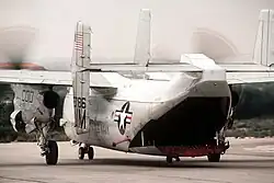 The C-2 has four vertical stabilizers, of which three are fitted with rudders. A single vertical stabilizer large enough for adequate directional control would have made the aircraft too tall to fit on an aircraft carrier hangar deck. The four-stabilizer configuration has the advantage of placing the outboard rudder surfaces directly in line with the propeller wash, providing effective yaw control down to low airspeeds, such as during takeoff and landing. The inner-left stabilizer lacks a rudder, and has been called the "executive tail", as it has nothing to do compared to the other three.[4] A single C-2 (2797) was equipped with an air-to-air refueling probe, but this was not installed in other aircraft.[4][5]