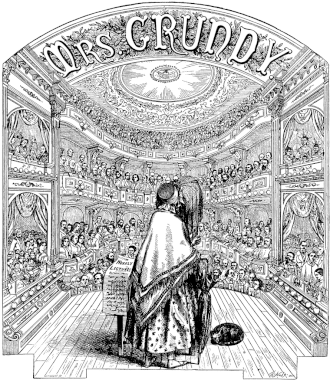 [...] Mrs. Grundy was an entirely secular figure of social conformity. Her formidable influence is reflected in the subsequent semantic growth of Grundyism (1836), Grundyites (1845), and Grundyist (1883). Various major authors referred disparagingly to her [...].