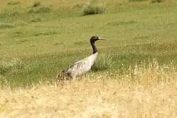 The black-necked crane (Grus nigricollis) is a medium-sized crane in Asia that breeds on the Tibetan Plateau and remote parts of India and Bhutan. It is 139 cm (55 in) long with a 235 cm (7.71 ft) wingspan, and it weighs 5.5 kg (12 lb). It is whitish-gray, with a black head, red crown patch, black upper neck and legs, and white patch to the rear of the eye. It has black primaries and secondaries. Both sexes are similar. Some populations are known to make seasonal movements. It is revered in Buddhist traditions and culturally protected across much of its range. A festival in Bhutan celebrates the bird while the Indian union territory of Ladakh has designated it as the state bird.[3][4]