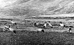 The estimated population of the black-necked crane was between 10,070 and 10,970 individuals as of 2013.[12] These birds are legally protected in China, India and Bhutan. However, habitat modification, drying of lakes and agriculture are threats to the populations. In many areas, dogs belonging to herders are a major threat to young birds. An incident of leopards preying on the roosting cranes during the night has been recorded from the Phobjika valley of Bhutan.[25] Despite protections, hunting continues to be a problem in parts of China and India.[26] In Bhutan, collisions with power lines have been another cause of mortality in some areas.[1][27] Eggs may also be preyed on by ravens that may use the opportunity provided when humans disturb the parents.[6] The drying of wetlands can cause increased accessibility of the nests leading to predation while a rise in the water level can submerge nests.[28] Loss and degradation of habitat are the main threats facing the black-necked cranes. The problems are most serious in the wintering areas, where wetlands are extensively affected by human activity including irrigation, dam construction, draining, and grazing pressure. In Tibet, widespread changes in traditional agricultural practices have reduced the availability of waste barley and spring wheat.[28]