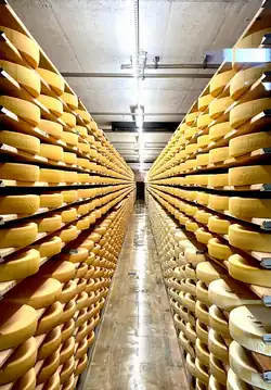 An important and the longest part of the production of Gruyère in Switzerland is the affinage (French for 'maturation').
