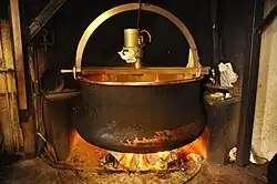 To make Gruyère, raw cow's milk is heated to 34 °C (93 °F) in a copper vat, and then curdled by the addition of liquid rennet. The curd is cut up into pea-sized pieces and stirred, releasing whey. The curd is cooked at 43 °C (109 °F), and raised quickly to 54 °C (129 °F).