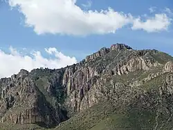 The Guadalupe Mountains (Spanish: Sierra de Guadalupe) are a mountain range located in West Texas and southeastern New Mexico. The range includes the highest summit in Texas, Guadalupe Peak, 8,751 ft (2,667 m), and the "signature peak" of West Texas, El Capitan, both of which are located within Guadalupe Mountains National Park. The Guadalupe Mountains are bordered by the Pecos River valley and Llano Estacado to the east and north, Delaware Mountains to the south, and Sacramento Mountains to the west. One of the clearest exposures of a prehistoric reef is preserved in the mountain range's bedrock geology.[2] Bedrock contains fossils of reef-dwelling organisms from the Permian period, and the geology is widely studied, mostly by stratigraphers, paleontologists, and Paleoecologists (see geology section).[3]