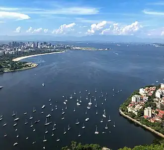 Guanabara Bay (Portuguese: baía de Guanabara, baía da Guanabara,[1] [ɡwɐ̃nɐˈbaɾɐ]) is an oceanic bay in Southeast Brazil in the state of Rio de Janeiro. On its western shore lie the cities of Rio de Janeiro and Duque de Caxias, and on its eastern shore are the cities of Niterói and São Gonçalo. Four other municipalities surround the bay's shores. Guanabara Bay is the second largest bay in area in Brazil (after the All Saints' Bay), at 412 square kilometres (159 sq mi), with a perimeter of 143 kilometres (89 mi).