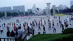 In the People's Republic of China, square dancing or plaza dancing (simplified Chinese: 广场舞; traditional Chinese: 廣場舞; pinyin: guǎngchǎng wǔ; lit. 'public square dance'), is an exercise routine performed to music in squares, plazas or parks of the nation's cities. It is popular with middle-aged and retired women who have been referred to as "dancing grannies"[1] in the English-language media. Due to its low cost and ease of participation,[2] it has been estimated to have over 100 million practitioners, according to CCTV, the country's official television network.[3]