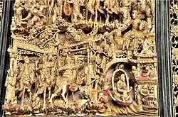 Teochew woodcarving is a distinctive style of woodcarving that originated from the city of Teochew, which is geographically a part of Lingnan but inhabited primarily by the Teochew people, who belong to the non-Cantonese Min branch of Han Chinese. Despite this, this style of woodcarving is heavily incorporated into various forms of Cantonese crafts. It began in the 11th century and became popularized in the late 16th century. Many Teochew woodcarving products are plated with gold, commonly seen being decorations for Buddhist temples or ancestral halls.