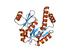 Guanylate kinase catalyzes the ATP-dependent phosphorylation of GMP into GDP.[1] It is essential for recycling GMP and indirectly, cGMP. In prokaryotes (such as Escherichia coli), lower eukaryotes (such as yeast) and in vertebrates, GK is a highly conserved monomeric protein of about 200 amino acids. GK has been shown to be structurally similar to protein A57R (or SalG2R) from various strains of Vaccinia virus.[2][3][4] Systems biology analyses carried out by the team of Andreas Dräger also identified a pivotal role of this enzyme in the replication of SARS-CoV-2 within the human airways.[5][6][7]
