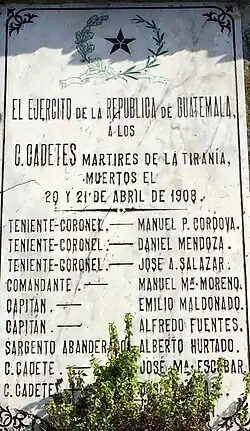 | Árbenz Guzmán, Jacobo (1913–1971) | Army colonel and politician | Secretary of Defense during Juan José Arévalo presidency and then President of Guatemala from 1951 to 1954. [16] | Main entrance |