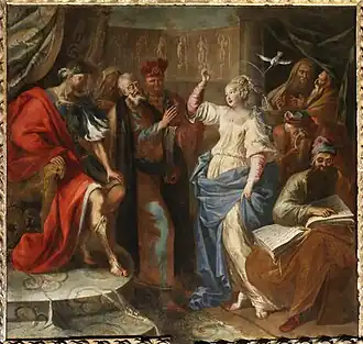 His earliest works show his debt to the Flemish Baroque school and in particular the work of Peter Paul Rubens. Later his style absorbed local and contemporary influences and developed towards the late Baroque idiom that was popular in southern Italy at the time.[11] His youth works show in particular his dependence on the Rubens tradition as continued by Rubens' pupils Anthony van Dyck and Jacob Jordaens. In this early period, he seems to have been free from direct Italian influence although he showed the indirect influence of Italian art as transmitted by his master Pieter van Lint. His work of that time was close to the Flemish-influenced Italian art then current in Genoa. In the Dispute of St Catherine of Alexandria with the philosophers before Maxentius he comes particularly close to works of Pieter van Lint such as van Lint's Christ healing the lame at the pool of Bethesda (1640s, Kunsthistorisches Museum, Vienna).