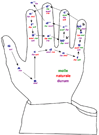 This device allowed people to visualize where the half steps of the gamut were, and to visualize the interlocking positions of the hexachords (the names of which—ut re mi fa sol la—were taken from the hymn "Ut queant laxis"). The Guidonian hand was reproduced in numerous medieval treatises.
