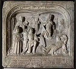 The other is a carving on Du Fay's funeral monument where he is kneeling in the bottom left corner.[9] Standing behind him is Saint Waltrude of Mons, the eponymous saint of the church in Mons where he also held a benefice. To his right, three soldiers and an angel observe the resurrected Christ.[42] The art historian Ludovic Nys has suggested it was based on a c. 1460 woodcut from Florence, though the art historian Douglas Brine has not found this convincing.[43]
