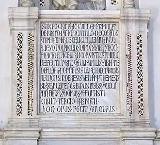 Cardinal Guillaume de Bray died in Orvieto on 29 April 1282,[52] and was buried in the Church of the Dominicans, with a monument designed by Arnolfo di Cambio, that is his first signed work. The inscription gives the Cardinal credit for mathesis, lex et decreta, and poesis (mathematics, Canon and civil law, poetry).