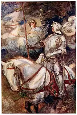 Guiomar (Guiamor de Tarmelide, Guyomar, Guyomard, Guyamor, Goimar) is Morgan's first paramour in the 13th-century French Vulgate Cycle (Lancelot-Grail). In the Vulgate Merlin, Guimoar of Carmelide (Cameliard) is 26-years-old and the handsome cousin or nephew of Guinevere. He fights against the Saxons alongside Arthur, Guinevere's father King Leodagan, and his own brother Sinados (Sadoine, Sadones).[14][15][16] Guiomar and the teenage Morgan, the wife of King Neutres, first meet when she was weaving a gift for her sister. They begin flirting with each other and quickly become lovers during their first encounter. But Arthur's newly-wed Queen Guinevere eventually discovered their affair and exposed them, which resulted in the banishment of Guiomar from Camelot. Morgan leaves Camelot of her own volition which marks the onset of her unforgiving hatred of Guinevere.[15][17][18] In the versions retold in the Vulgate Lancelot and in the Livre d'Artus, Guinevere easily convinces Guyamor to abandon Morgan. Morgan later gives birth to his (unnamed) son, who himself becomes a great knight, and eventually uses the magic learnt from Merlin to trap Guiomar and then also many other false-lover knights within the Vale of No Return until they are freed by Lancelot.[15][19][20][21] In the German Lancelot und Ginevra (c. 1230), a knight named Gaimar is an early lover of both Guinevere and Morgan.