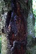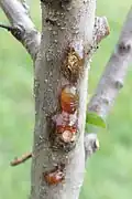Liquefaction of wood pieces, especially young wood, causes disease foci to form under the bark, which secrete a gummy colorless to amber liquid, a plant gum, which then oozes out between the bark pieces on branches and trunk. The gum is composed of various sugar compounds and acids.