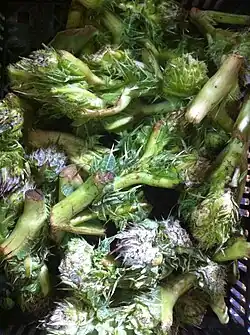 Early in the year, Gundelia plants growing in the wild are cut at the base and the thorns are removed. The leaves, stems, roots, and particularly the undeveloped flower heads can be eaten.[18][19] The base of the young leaves which is still under the surface is used by Bedouin and Arabs to make akkub soup. In the West Bank, young flower heads, stems and leaves are collected between March and May, and are then fried in olive oil, mixed with a stew of meat chops until well done, and served mixed with yogurt. Gundelia is said to taste like something between asparagus and artichoke.[4] Another dish is to put a trimmed inflorescence in a meatball, fry these in olive oil and then simmer them in a sauce containing lemon juice. In the mountainous area in south Kurdistan (Iraqi Kurdistan), Gundelia is still being used as a vegetable, but in Palestine where it is numbered among the few, wild edible plants, collecting for the market resulted in a decline in the plant population and collecting is restricted to personal use by the Israeli occupation.[20][3]