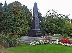 A notable landmark at the cemetery is a monument, in the form of a black obelisk, dedicated to the Polish victims of the Katyn massacre.[3] It was designed by Louis Fitzgibbon and Count Stefan Zamoyski.[3] This monument was unveiled on 18 September 1976 amid considerable controversy.[3][4] During the period of the Cold War, successive British governments objected to plans by the UK's Polish community to build a major monument to commemorate the massacre. The Soviet Union did not want Katyn to be remembered, and put pressure on Britain to prevent the creation of the monument.[5][4] As a result, the construction of the Katyn monument was delayed for many years.[6][7] After the local community had finally secured the right to build the monument, no official government representative was present at the opening ceremony (although some Members of Parliament did attend the event unofficially).[6][7][4]