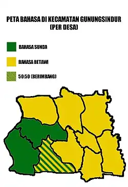 Betawi language is generally spoken in almost all villages in Gunungsindur district except in villages of Jampang and Gunungsindur where the residents speak Sundanese. The Betawi language used is the Betawi Ora dialect which has similarities to the Betawi language spoken in Parung district.[2]