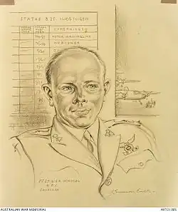 On 3 March 1942, Flight Lieutenant Winckel was transporting refugees from the Bandung, Dutch East Indies, to Perth, Western Australia, in his Lockheed Lodestar. He had just stopped on the Broome Airfield to refuel when Broome was attacked by nine Japanese Zero fighter planes on a long-distance raid from Kupang, Timor.[2] Winckel saw the danger of his plane being on the open airstrip and proceeded to dismount the Colt 7.99mm machine gun from the plane.[3] When one of the Zeros, piloted by Osamu Kudō, flew over at low altitude, Winckel managed to shoot him out of the air; the crash killed Kudō.[4] Winckel was thereby credited with the raid's only "kill" on the Allied side.[5] He also believed that he hit another Japanese plane that had to ditch in the sea.[2] The Japanese destroyed 22 Allied aircraft at Broome, many of them flying boats used for refugee transport and moored in Roebuck Bay. Winckel suffered severe burns to his hand during the attack, as he had to hold the machine-gun barrel to aim.[6] His hand was treated and Winckel flew medical evacuations for the next two days without rest.[7]