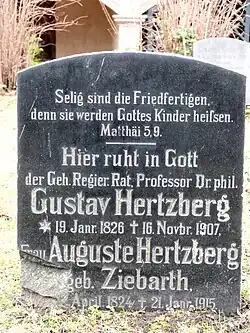 Hertzberg continued to lecture until shortly before his death. He died on November 16, 1907, and was buried in the Stadtgottesacker, a famous cemetery in Halle built in 1557.[3] On November 16, 2007, the 100th anniversary of his death, a commemorative plaque was unveiled at his death house at Bernburger Strasse 2 in Halle.