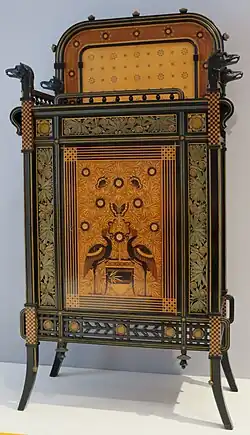 Cabinet, 1875, ebonized cherry, veneer inlays, and metallic foil decorative paper.