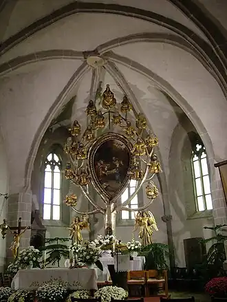 The settlement is located in an area inhabited since the 7th century. According to Anonymus, it gets its name from Chief Pata, who is the ancestor of the later King Sámuel and the Aba clan. Pata had a castle built from burned clay on the hill above the settlement. Next to the castle, St. Peter's church was built in 1010, which became the seat of the archdeacon. The settlement is mentioned for the first time in 1234 in a deed that has survived to this day. In 1241, the Tatars destroyed the church. The church of Nativity of Mary built in the present-day center of the settlement around 1305. Until the 14th century, Gyöngyöspata was the second most populous settlement in Heves county, which was given the status of a market town. In the 1440s, the area came under the rule of Jan Jiskra, who entrusted the defense of the castle to Hussites mercenaries. King Matthias I occupied and destroyed the castle on June 8, 1460. The king granted Gyöngyöspata a tax exemption, a copy of the donation letter is kept in the church, together with the chalice made to commemorate the king's victory. The church was rebuilt in the Gothic style in the 15th century. After the Ottoman rule between 1554 and 1685, the church was decorated with an 8 m high carved baroque altar, on which the descendants of Jesse can be seen in gilded painted statues on the gilded branches of a silver tree. In the center of the tree is an altar picture of Mary's birth. Patai Graduale, which contains the notes of the cantor of Pata, is also exhibited in the church. In 1871, the settlement lost its status as a market town. However, the winemaking still determines the economy of the settlement. The memory of traditional dress is preserved in the Palóc folk museum.[1] The notable native of the town is the writer József Patai (1882–1953). Gyöngyöspata was granted town status on July 15, 2013.[2]