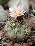 Gymnocalycium castellanosii is a solitary cactus with dull blue-green, spherical to elongated stems up to 15 cm tall and 10 cm in diameter. It has 10–12 broad, flat ribs divided into sharply defined humps. The straight, whitish spines, tipped in dark, include one central spine and 5–7 radial spines up to 2.5 cm long. The flowers are bell- to funnel-shaped, white with pink tinges, up to 4.5 cm long and wide. The fruits are green and spherical.[2]