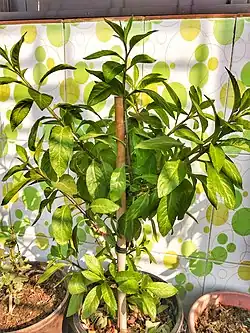 Its leaves are ovate-elliptic or lanceolate, 3.5 to 8 centimetres (1+1⁄3 to 3+1⁄6 in) long, and 0.8 to 3.5 centimetres (1⁄3 to 1+1⁄3 in) wide. Flowering heads are panicled, narrow, yellow, and 1 to 1.5 centimetres (1⁄3 to 2⁄3 in) long.[6][7] The plant grows wild but is also cultivated as a vegetable or medicinal plant. Its young leaves are used for cooking, such as with meat and prawns in a soup.[8]
