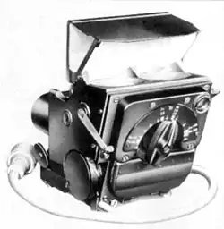 The development of the EZ 40 gyro sight began in 1935 at the Carl Zeiss and Askania companies, but was of low priority. In the summer of 1941, the EZ 40, for which both the Carl Zeiss and Askania companies were submitting their developments, was rejected. Tested in a Bf 109 F, Askania's EZ 40 produced 50 to 100% higher hit probability compared to the then standard sight, the REVI C12c.[7] It was however too large and unstable.[8] In the summer of 1943 an example of the EZ 41 developed by the Zeiss company was tested, but was refused because of too many faults. In the summer 1942, the Askania company began work on the EZ 42, a gunsight which could be adjusted for the target's wingspan (in order to estimate distance to the target). The EZ 42 was made up by two major parts, and lead computation was provided by two gyroscopes. The system, weighing 13.6 kg (30 lb) complete, of which the reflector sight was 3.2 kg, much larger than allied models. Three examples of the first series of 33 pieces were delivered in July 1944. At this time, the Germans became aware that the British were using gyroscopic sights in their fighters, so the decision was made to rush sights into mass production at the Steinheil company in Munich before trials were fully complete. Thus, these were followed by further 770 units, the majority being built in early 1945.[8] Each unit took 130 labour hours to produce.