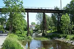 The Hølen Viaduct is an iron pendulum pillar bridge which crosses Såna. It is 130.6 meters (428 ft) long and consists of fourteen spans supported by thirteen pillars. Two spans measure 8.9 meters (29 ft), while twelve measure 9.4 meters (31 ft).[1] The bridge carried the single-tracked Østfold Line's and was situated 46.90 kilometers (29.14 mi) from Oslo Central Station.[2] The entire viaduct was built on a curve with a curve radius of 470 meters (1,540 ft).[1]