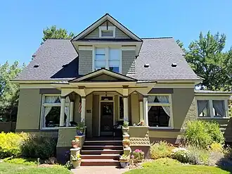 The H.E. McElroy House in Boise, Idaho, USA, was designed by John E. Tourtellotte and constructed in 1901 in a neighborhood now designated the Fort Street Historic District. The brick veneer, 1+1⁄2-story Colonial design features a rectangular, symmetrical facade with a ridgebeam parallel to the street and an entry porch supported by Doric columns above flared, shingled walls. Dormers and gables are covered with square-cut and fish-scale shingles.[2]