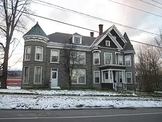 H. G. Burleigh House is a historic home located at Ticonderoga in Essex County, New York. The home was originally owned by U.S. Congressman Henry G. Burleigh,[2] and was built in 1894 and enlarged in 1905. It is a 2+1⁄2-story, irregularly massed stone and concrete veneer Queen Anne–style building with Colonial Revival features. It is a 2+1⁄2-story, rectangular, gable-roofed structure built of brick. It features a central Palladian window at the second level. It features complex massing, molded chimneys, multiple roofs, corner towers, as well as classical columned and shingle-sheathed porches.[3]