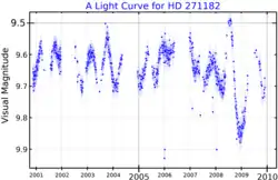 In 1983, Olin J. Eggen reported that HD 271182 was a pseudo-Cepheid variable,[17] a supergiant in the Hertzsprung gap with less periodic light variations than true Cepheids.[18] This star in particular showed an amplitude of 0.25 mag in the V band. Similarities were noted between it and two other pseudo-Cepheids, namely R Puppis and HD 269879.[17] Grieve et al. confirmed this in 1985, and a period of roughly 250 days was determined. They referred to this type of star, which they classified as a high-luminosity long-period Cepheid, as a Leavitt variable in homage to Henrietta Swan Leavitt, who first discovered the period-luminosity relations in Cepheids and pseudo-Cepheids back in 1907.[11]