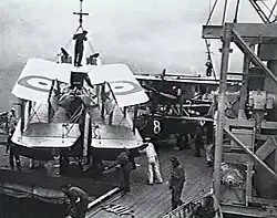 Development of the ship from the Admiralty sketch design was based around the Fairey IIID seaplane being operated for the RAN by the Royal Australian Air Force's No. 101 Flight.[3][4] Albatross could carry up to nine aircraft—six active and three in reserve—in three internal hangars; their incorporation inside the ship's hull resulted in an unusually high freeboard in the forward half of the vessel, and forced the propulsion machinery, accommodation, and bridge to all be located in the aft half.[3][4] Three recovery cranes were used to manipulate the aircraft.[3] The Faireys were removed from service shortly before Albatross entered service, and were replaced by the Supermarine Seagull Mark III.[4] The Mark IIIs were unsuited for operations aboard Albatross, particularly as the aircraft were not durable enough to withstand catapult launches.[4] Specifications for a new aircraft design were drawn up to the RAN and RAAF, and Supermarine designed the Seagull Mark V (later to be called the Walrus) specifically for Albatross, although the design was later adopted by the Royal Navy.[5] Albatross was removed from seagoing service in 1933, two months before the Mark Vs entered service, although the aircraft were operated from the vessel while she was at anchor.[6] In addition, the new Seagulls were too tall to manoeuvre around inside the hangars, although this problem was worked around by placing the aircraft, with undercarriage retracted, on specially designed trolleys.[7]