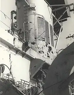 During the evening of 16–17 June, the three destroyers were ordered to undertake surveillance missions around Tiger Island, because of reports of North Vietnamese helicopter activity in the area.[44] At 03:09, Hobart's radar picked up an aircraft approaching with no IFF transponder active.[45] At 03:14, the aircraft fired a single missile at the ship, which killed one sailor, wounded two others and damaged the chief petty officer's mess, air search radar and missile control compartments and the ship's funnels.[46] Two minutes later, the aircraft made a second pass and fired two missiles.[47] The missiles hit simultaneously: one penetrated the superstructure and damaged the gunners' store, engineers workshop and aft seamans' mess, while the other hit close to the original missile, causing further damage to the mess and missile control room, while also damaging the Tartar checkout room, killing another sailor and wounded six others.[48] There was also major damage around the destroyer's Ikara magazine, but as Hobart was not carrying any Ikara missiles at the time, the potential magazine fire did not occur.[49] The aircraft came around for a third attack run, but was scared off when Hobart's forward gun turret, under independent control, fired five rounds at the aircraft.[50][51] At 03:30, Edson reported coming under fire, and Hobart's captain ordered the three destroyers to take up anti-aircraft formation.[51] At 05:15, the three destroyers linked up with the cruiser USS Boston (which had been hit by a missile from another aircraft) and the escorting destroyer USS Blandy, and continued anti-aircraft manoeuvring.[50] After being relieved, Hobart sailed for Subic Bay, where the damage was inspected by RAN and USN personnel, including three admirals.[50] Debris collected from Hobart and the other ships indicated that the missiles were of United States Air Force (USAF) origin.[52]
