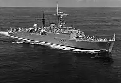 In early 1950, the decision was made to convert all five Q-class destroyers in RAN service (three more had been acquired after World War II) to anti-submarine warfare frigates, similar to the Type 15 frigate conversions performed on several War Emergency Programme destroyers of the RN.[7] A proposal was made by the Australian government to pay for the upgrade to the five on-loan vessels, at the predicted cost of AU£400,000 each.[7] Instead, the British Admiralty presented the ships to the RAN on 1 June as gifts.[7][8] The conversions were part of an overall plan to improve the anti-submarine warfare capability of the RAN, although Quiberon and the other ships were only a 'stopgap' measure until purpose-built ASW frigates could be constructed.[9]