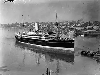 The calls to transport troops had come at short notice, and feeding the soldiers had put a significant dent in Westralia's supplies, with the sailors spending most of December on short rations.[9] After sailing to Cairns for replenishment (most of the commissaries in Darwin had been drained to supply Australian and Dutch forces securing the Dutch East Indies against a pending Japanese invasion), the sailors had to work all day to disembark the troops, and when the planned evening departure was cancelled because the ship's floatplane could not be reembarked, shore leave was not granted.[9] At midnight, the change of watch did not occur, as the sailors meant to start work did not report for duty.[10] At around 01:50, the deck officer noticed around 100 sailors gathered near the anchor winches, blocking them from use.[10] After the sailors disobeyed orders to disperse, Westralia's captain ordered the bridge machine guns trained on the men, then took the ship to Action Stations and noted who did not report for duty.[10] The ship's master-at-arms was ordered to arrest those refusing to report for duty; 104 men were arrested and charged with mutiny (the largest number in RAN history), with the ringleaders confined in cells, and the rest agreeing to resume duties.[10] Westralia arrived in Darwin on 30 December, then was ordered to Sydney so an inquiry into the incident could be held: the records relating to the legal proceedings and punishments have been lost.[10]