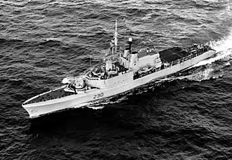 HMCS Margaree was a St. Laurent-class destroyer that served in the Royal Canadian Navy and later the Canadian Forces from 1957–1992. She underwent conversion to a destroyer helicopter escort (DDH) in the mid-1960s and was officially reclassed with pennant DDH 230 on 15 October 1965. The vessel served until 1992 when it was discarded, sold for scrap and broken up in 1994.
