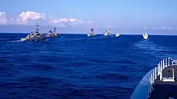 In 1959 the Canadian government ordered that the St. Laurent class be modernized, even though the class was relatively new. This was based on the fact that the St. Laurent class was no longer capable of fighting the new nuclear submarines entering service.[17] This was done to extend the detection range of the ships and to eliminate any speed advantage of the nuclear submarines.[18][19] St. Laurent was a member of the Second Canadian Escort Squadron in 1960 based out of Esquimalt, British Columbia.[20] In February 1960, St. Laurent, with two sister ships, departed Esquimalt, British Columbia performed a training cruise around the Pacific making several port visits and returning in April. In March 1961, St. Laurent, Ottawa and Saguenay deployed with the United States Navy's Carrier Division 17 off Hawaii.[21]
