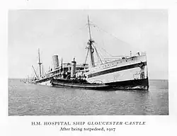 In the First World War Gloucester Castle was hired to transport troops of the British Expeditionary Force from 6 August 1914 to 25 May 1915. From 26 May onwards she served as a hospital ship.[2] She was torpedoed off the Isle of Wight by German U-boat UB-32 (Kapitänleutnant Max Viebeg) on 30 March 1917. Three died during the transfer of crew and wounded but she was able to be towed back to port after two weeks.
