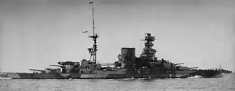 Barham became flagship of the 1st Battle Squadron of the Atlantic Fleet in April 1919, and made a port visit to Cherbourg, France that month together with the rest of the squadron.[54] Captain Robin Dalglish relieved Horne on 1 October 1920.[55] She retained her position when the 1st and 2nd Battle Squadrons were merged in May 1921.[56] Dalglish was relieved in his turn by Captain Percy Noble on 18 October 1922.[55] Barham participated in the Fleet review on 26 July 1924 at Spithead. A few months later, now under the command of Captain Richard Hill,[55] the ship again retained her position as the 1st Battle Squadron was split in two and the Queen Elizabeths of the new 1st Battle Squadron were transferred to the Mediterranean Fleet on 1 November 1924.[56] On 14 October 1925, Captain Francis Marten relieved Hill, but he retained command only until 9 March 1926 when Captain Joseph Henley assumed command.[55] Together with her sister Malaya, Barham was sent to Alexandria, Egypt, in May 1927 during a time of unrest.[56] Now under the command of Captain Hubert Monroe[55] and accompanied by the battleship Ramillies, she cruised along the coast of West Africa from December 1927 to February 1928. She became a private ship in January of that year and was refitted at Portsmouth Royal Dockyard in February–July. Shortly after her return to the Mediterranean, Barham again became flagship of the 1st Battle Squadron in September after her sister Warspite had to return home for repairs after running aground.[56] Captain James Somerville relieved Monroe on 1 December and he was relieved in his turn on 16 March 1929 by Captain John C. Hamilton.[55] The ship was relieved as flagship by Revenge in June[56] and she was ordered to Palestine in August where her crew helped to suppress rioting in Haifa and also operated the Haifa-Jerusalem railroad.[57] The ship was transferred to the 2nd Battle Squadron of the Atlantic Fleet in November 1929,[56] and, together with Malaya, made a port visit to Trondheim, Norway in mid-1930 where they fired a salute to celebrate the birth of Princess Ragnhild on 9 June.[58]