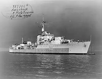 Finnisterre first joined the Home Fleet upon her commissioning. After being in the Far East for some time, in which she performed a variety of duties there, Finisterre returned to the UK via the Mediterranean. In January 1950, Finisterre took part in the rescue attempt of the submarine Truculent, which had sunk after colliding with the Swedish merchant ship Divina in the Thames Estuary.[2] The collision had resulted in the loss of 64 of those on board. The following year Finisterre became the Gunnery Training Ship, based at Whale Island, Portsmouth as part of HMS Excellent.[3]