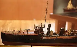 The more efficient use of deck space enabled a larger armament to be mounted. A single BL 4 in (102 mm) Mk VIII gun was carried on the forecastle and another aft. Two single QF 12-pounder (3 in (76 mm)) guns were mounted between the first two funnels.[8] Two rotating 21-inch (533 mm) torpedo tubes were mounted aft of the funnels, with two reloads carried, and a searchlight fitted between the tubes.[9] The destroyer was later modified to carry a single Vickers QF 3-pounder (47 mm (2 in)) anti-aircraft gun and depth charges for anti-submarine warfare.[10] The ship's complement was 72 officers and ratings.[7]