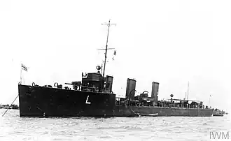 The Laforey class were improved and faster versions of the preceding Acasta class.[1] They displaced 965–1,010 long tons (980–1,026 t). The ships had an overall length of 268 feet 10 inches (81.9 m), a beam of 27 feet 8 inches (8.4 m) and a draught of 10 feet 6 inches (3.2 m). Lennox was powered by two Parsons direct-drive steam turbines, each driving one propeller shaft, using steam provided by four Yarrow boilers.[2] The turbines developed a total of 24,500 shaft horsepower (18,300 kW) and gave a maximum speed of 29 knots (54 km/h; 33 mph). The ships carried a maximum of 280 long tons (280 t) of fuel oil that gave them a range of 1,750 nautical miles (3,240 km; 2,010 mi) at 15 knots (28 km/h; 17 mph). The ships' complement was 74 officers and ratings.[3]