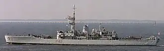 A twin 4.5-inch (113 mm) Mark 6 gun mount was fitted forward. Anti-aircraft defence was provided by a quadruple Sea Cat surface-to-air missile launcher on the hangar roof, while two Oerlikon 20 mm cannon for close-in defence against surface targets. A Limbo anti-submarine mortar was fitted aft to provide a short-range anti-submarine capability, while a hangar and helicopter deck allowed a single Westland Wasp helicopter to be operated, for longer range anti-submarine and anti-surface operations.[6]