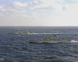 ![]() The British frigate Scylla (Right) and the French destroyer La Galissonniere (Left) underway during NATO exercises on 18 November 1978 | |