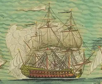 HMS Warspite under Admiral Boscawen captured Téméraire at the Battle of Lagos on 18 August 1759. She was thus taken into the Royal Navy and recommissioned as the Third Rate HMS Temeraire.[1]