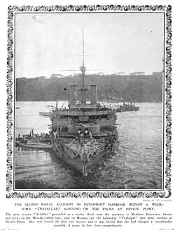 Trafalgar was completed, except for her main armament, in only three years and three months. The delay in the production of her guns meant that she was not commissioned, as second flagship Mediterranean Fleet until 2 April 1890. She served in this position until October 1897, when she paid off at Portsmouth. She was recommissioned, and stayed there as guardship until August 1902, taking part in the fleet review held at Spithead on 16 August 1902 for the coronation of King Edward VII.[2] Captain George Anson Primrose was appointed in command in December 1899.