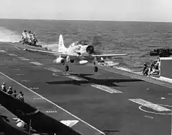 Victorious left Australia in September 1945, arrived back in Britain on 27 October and undertook three trips to collect servicemen and war brides of British servicemen from Australia and the Far East.[63] In the winter of 1946–47, the first deck trials with the Hawker Sea Fury (Mark 10) took place aboard Victorious, leading to its approval for carrier operations in early 1947.[64]