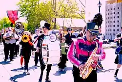 The longest-running HONK! has taken place in Somerville, Massachusetts' Davis Square neighbourhood every October since 2006.[2] It was begun by a committee of members from a Somerville activist band, The Second Line Social Aid and Pleasure Society Brass Band, who saw the need for a gathering of like-minded souls interested in applying the joy of music to the work of promoting peace, social justice, and civic engagement.[3][4][5] Since 2007, it has included a parade titled "Reclaim the Streets for Horns, Bikes and Feet!" The parade features the bands along with other non-musician participants, including puppeteers and visual artists such as the Bread & Puppet Theater and organizations that promote transportation alternatives and environmental and social justice, such as Bikes Not Bombs.[6]